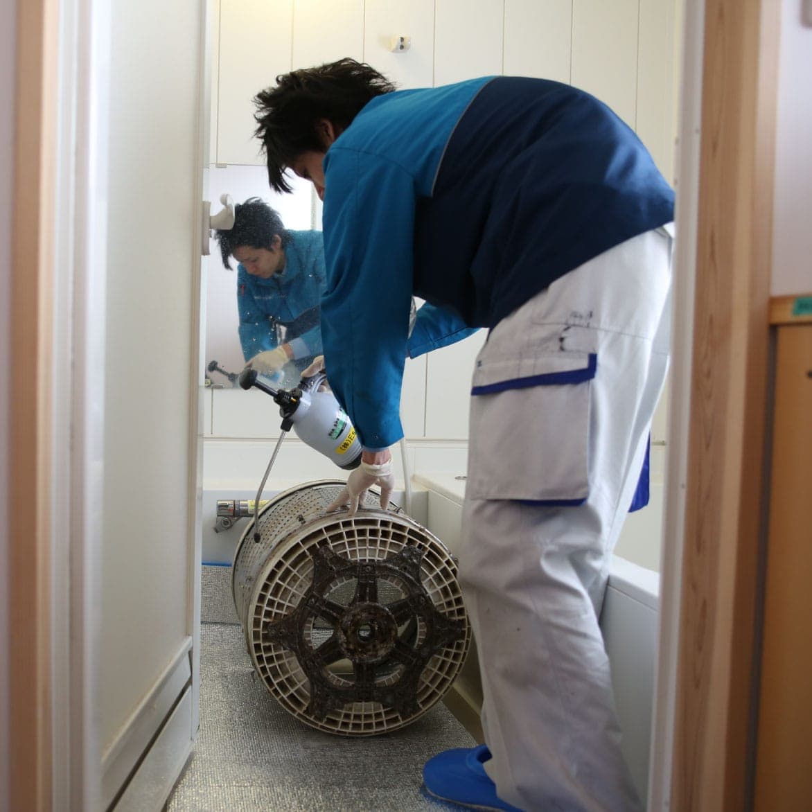 洗濯槽の内側の水垢も すみずみまで目視しながらクリーニング。