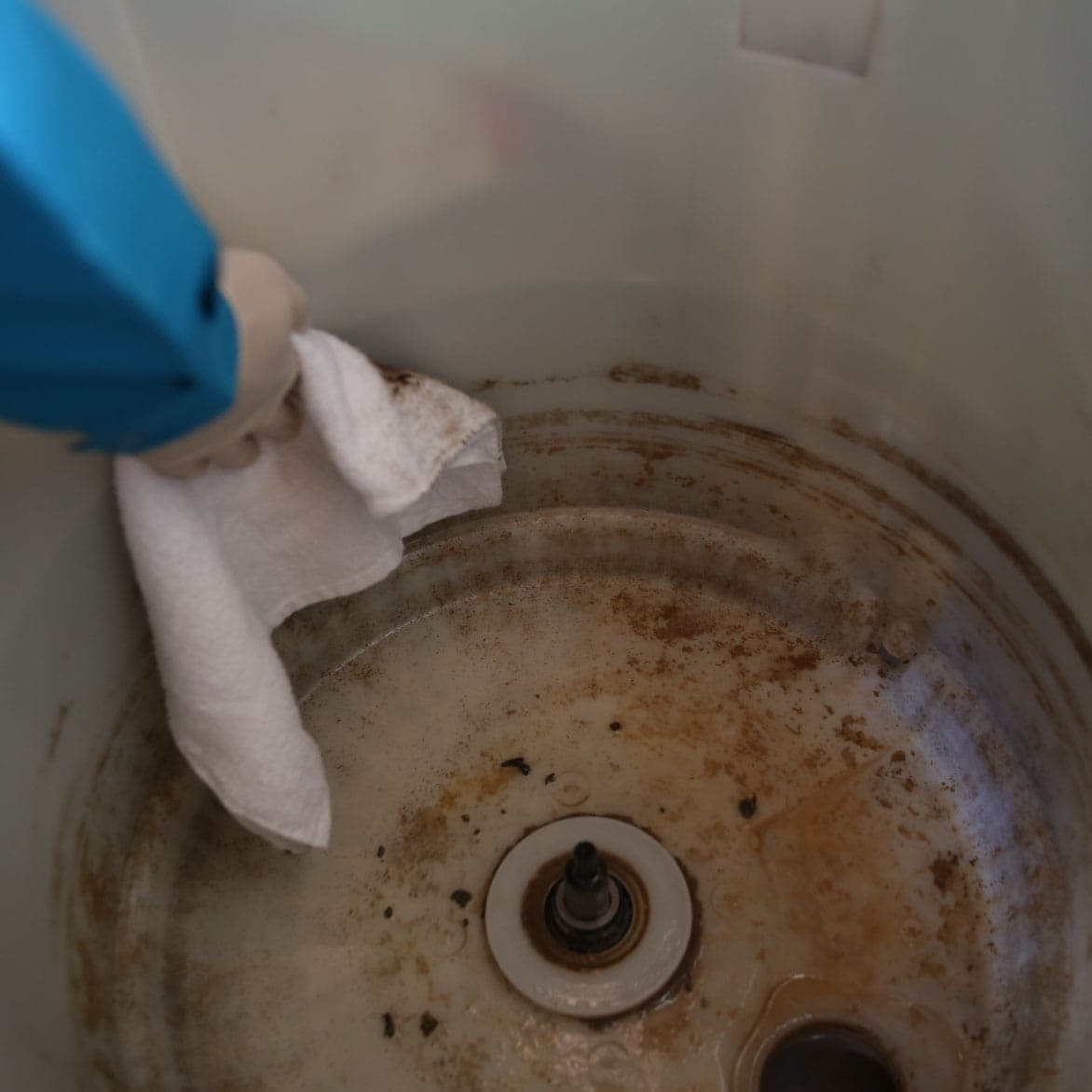 脱水槽の下部の様子。 固まった汚れがこびりついています。